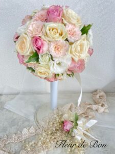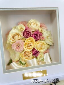 【お客様の声・神奈川県Y様より】昨日お花の受け取りをしました!箱を開けた瞬間から挙式のことを思い出して、 懐かしい気持ちになれました。作品の素晴らしさも、梱包の丁寧さも、 本当にお願いして良かったと思えるクオリティでした。挙式前は、 どこでお願いしようかと沢山調べて悩んでいたのですが、 今後周りで同じように悩んでいる方がいれば、「ここがいいよ!」 とお勧めしようと思います。本当にありがとうございました!【fleur-de-bonより】この度は数あるお店の中から当店をお選びいただきまして誠にありがとうございます。結婚式のブーケをホワイトフレーム〔シェリ〕へ保存させていただきました。とても可愛らしいブーケでした。ホワイトフレーム〔シェリ〕とブーケがマッチし、ブーケのイメージを残したまま保存できました。普段身につけられる〔ペンダント〕は銀箔と共にお花を閉じ込め華やかなお品です。お気に召していただきとても嬉しいです。このご縁に感謝し、末永いご多幸をお祈りいたします。またの機会をお待ちしております。