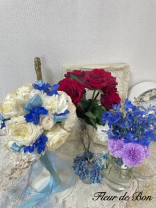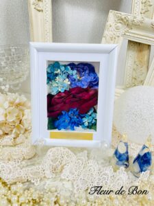 【お客様の大阪府F様より】本日無事お品物を受け取りました。当日の思い出が再び手元で残せる喜びでいっぱいです。素敵に仕上げてくださりありがとうございました【fleur-de-bonより】大切なお花の保存をご依頼いただきありがとうございます。挙式のブーケ、2種類の花束をお預かりし、2つの花束を合わせてホワイトフレーム〔ベル〕へ、白と青のコントラストが美しいブーケをグラスフラワープラン〔指輪ホルダー〕にて保存させていただきました。とても嬉しいお言葉をいただきお気に召していただけ幸いです。ご縁をいご縁をいただきありがとうございます。末永いご多幸をお祈りいたします。